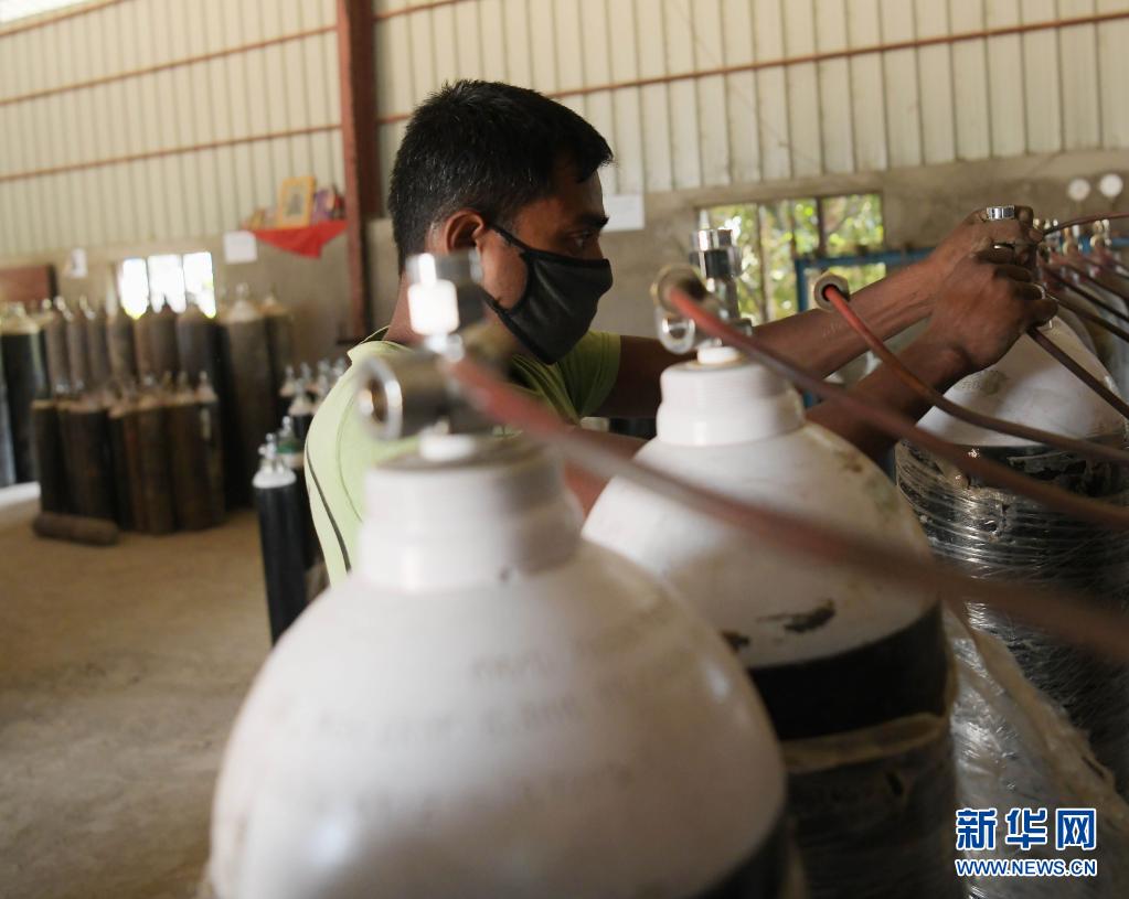 4月26日,工人在印度阿加尔塔拉填充氧气罐。新华社发
