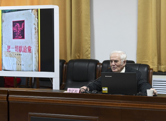 作为乌鲁木齐市委老干部局“党旗耀初心”宣讲团成员,李忆祖在为年轻党员们讲述自己经历时,在屏幕上放出自己购于1953年的《把一切献给党》书籍近照(4月21日摄)。 本报记者王菲摄