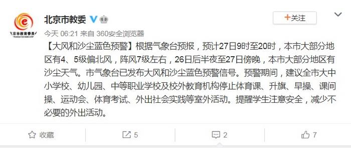 据北京市教育委员会官方微博消息,根据气象台预报,预计27日9时至20时,北京市大部分地区有4、5级偏北风,阵风7级左右,26日后半夜至27日傍晚,北京市大部分地区有沙尘天气。北京市气象台已发布大风和沙尘蓝色预警信号。