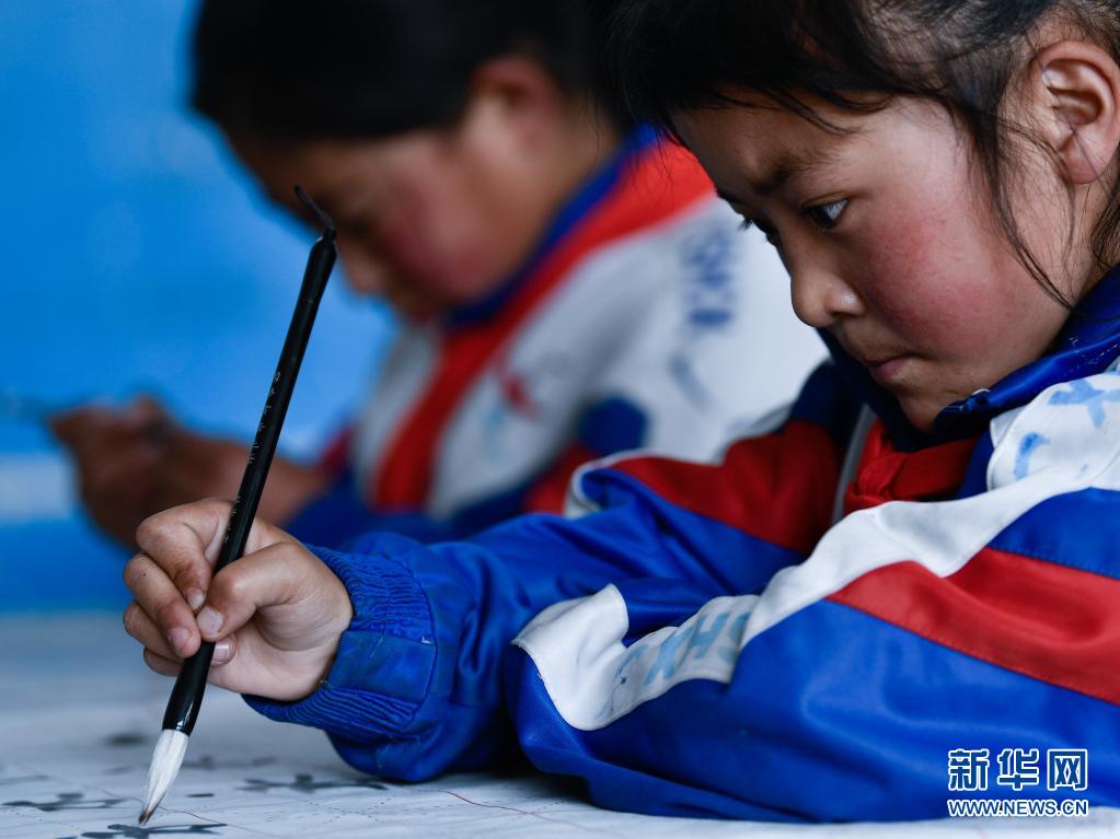 在玉树藏族自治州红旗小学,学生在上书法课。当地学校基础设施建设、教学配套资源提档升级获得了教育援青项目支持(3月19日摄)。 新华社记者 张龙 摄