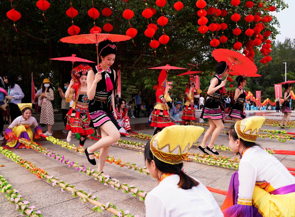 在“壮族三月三·八桂嘉年华”主会场,身着民族服饰的演员在跳竹竿舞(4月14日)。新华社记者杨驰 摄
