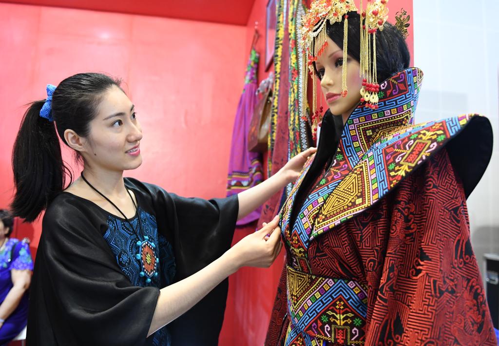在广西南宁国际会展中心,“90后”“壮锦女孩”范丽华整理作品《锦衣华服》壮锦嫁衣准备展出(2018年5月19日)。新华社记者陆波岸 摄