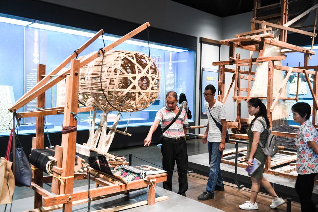 参观者在广西民族博物馆里参观壮族织锦机(2019年10月4日)。新华社记者 曹祎铭 摄