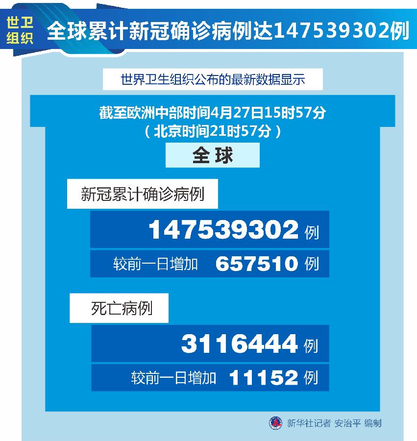 世卫组织网站最新数据显示,截至欧洲中部时间27日15时57分(北京时间21时57分),全球确诊病例较前一日增加657510例,达到147539302例;死亡病例增加11152例,达到3116444例。