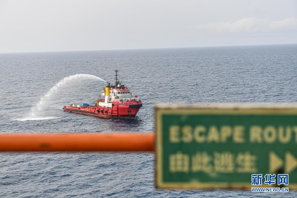 4月25日,为中国海油乐东15-1气田运送物资的拖船在南海北部海域参与该气田举行的应急演练。