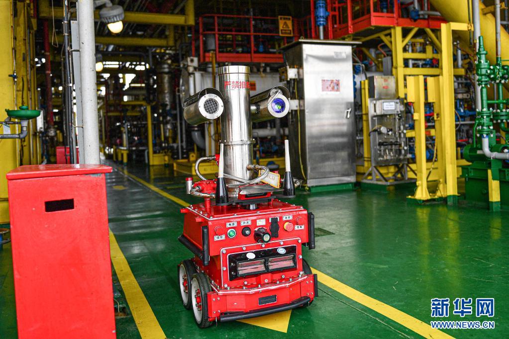 4月25日,巡检机器人在中国海油乐东15-1气田上进行巡检作业。