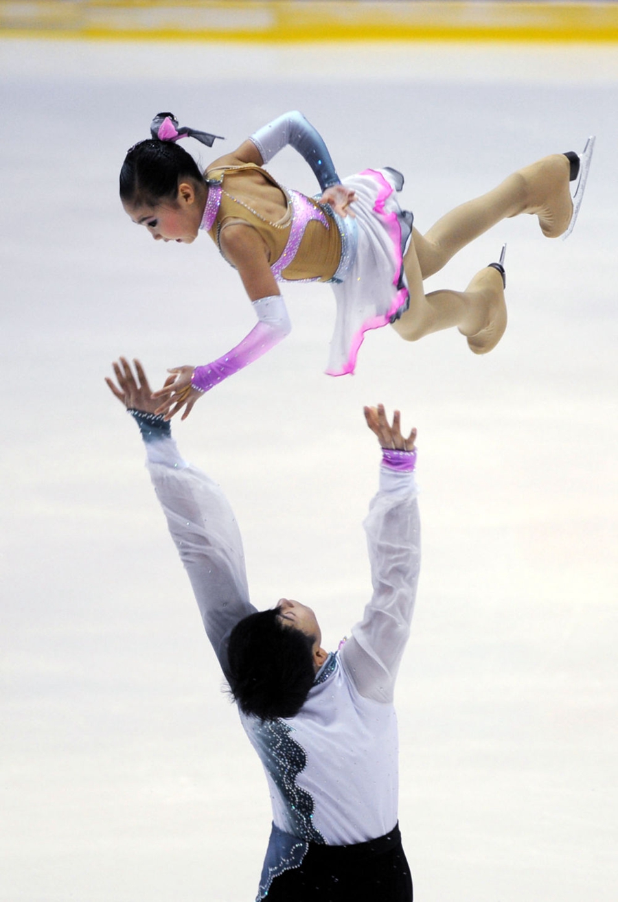 △2012年1月5日,张铭洋(上)与搭档解众参加第12届全国冬季运动会花样滑冰双人滑短节目的比赛。新华社记者 李紫恒 摄