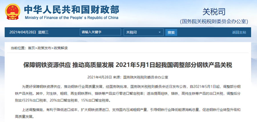 为更好保障钢铁资源供应,推动钢铁行业高质量发展,经国务院批准,国务院关税税则委员会近日发布公告,自2021年5月1日起,调整部分钢铁产品关税。其中,对生铁、粗钢、再生钢铁原料、铬铁等产品实行零进口暂定税率;适当提高硅铁、铬铁、高纯生铁等产品的出口关税,调整后分别实行25%出口税率、20%出口暂定税率、15%出口暂定税率。