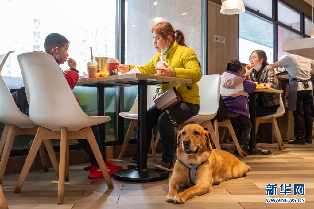 祝爱叶和儿子在餐厅吃饭的时候,导盲犬“多多”静静地趴在祝爱叶身边(3月13日摄)。