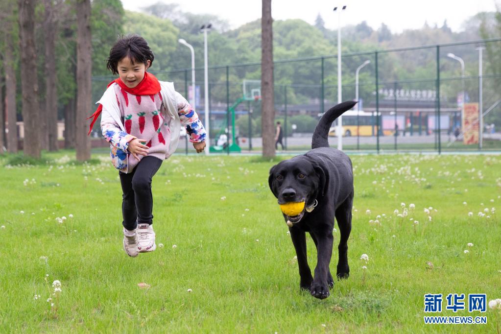导盲犬“C罗”和吴虎刚的女儿在草地上玩耍(4月26日摄)。 新华社发 (张梦 摄)