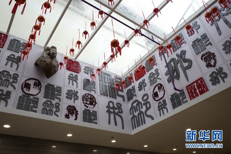 那马服务区主体综合楼一层“那字墙”上,展示“那”字在汉字和古壮字中的各种不同写法。新华网聂晨静 摄