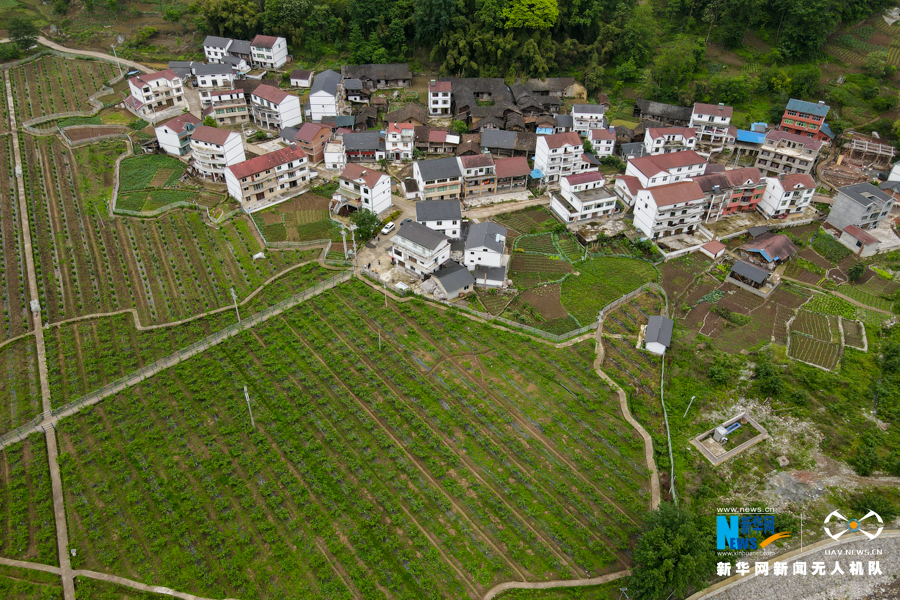 村庄换新颜,田园如画卷。航拍丰都三建乡双鹰坝村新发展起来的水果采摘圆。新华网 耿骏宇 摄