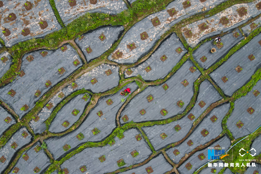航拍丰都三建乡蔡森坝村苗圃基地内。该基地内有500多名当地的村民以土地入股的方式参与产业发展。新华网 耿骏宇 摄