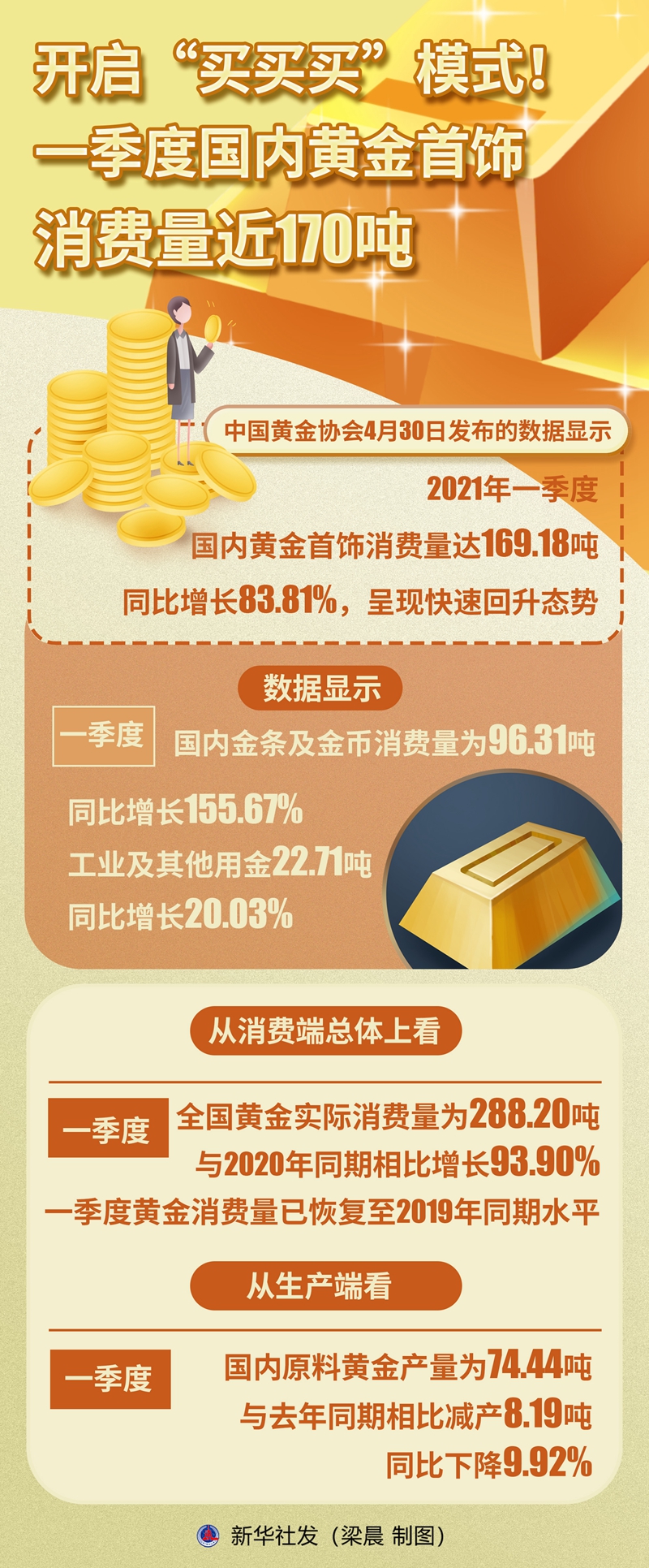 新华社北京4月30日电(记者王希)中国黄金协会30日发布的数据显示,今年一季度,国内黄金首饰消费量达169.18吨,同比增长83.81%,呈现快速回升态势。