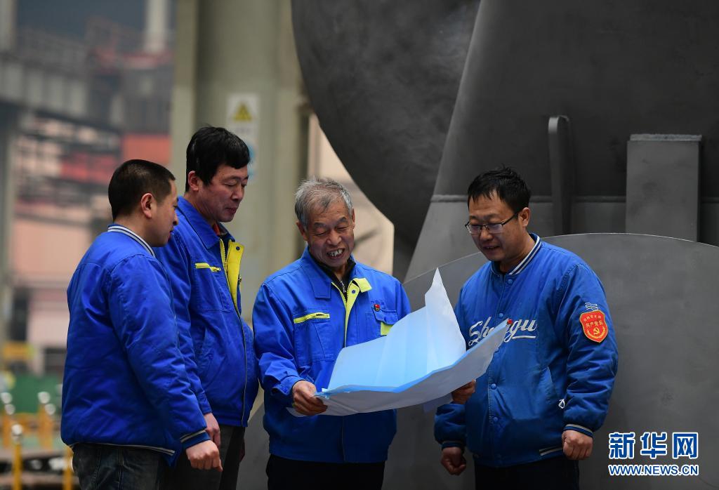 杨建华(右二)在沈鼓集团车间和同事一起研究图纸(2021年3月11日摄)。新华社记者 杨青 摄