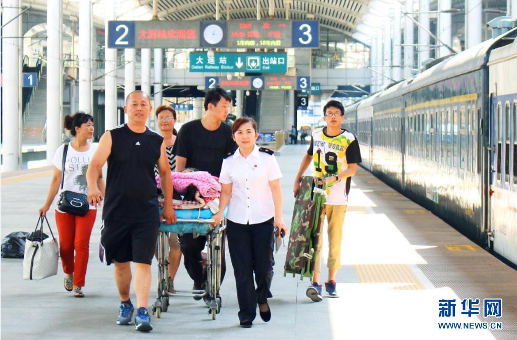 胡金玲(左)在大连火车站照顾旅客(资料照片)。新华社发