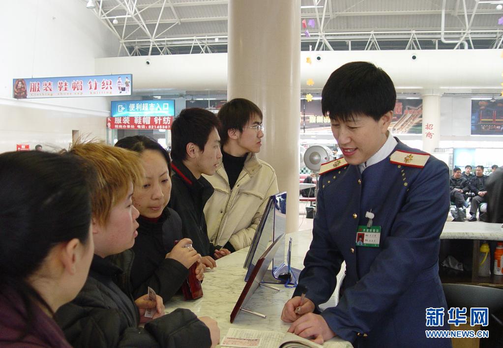 吕玉霜在大连火车站解答旅客询问(2005年3月16日摄)。新华社发