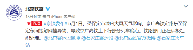 5月1日,受保定市境内大风天气影响,京广高铁定州东至保定东间接触网挂异物,导致京广高铁上下行部分列车晚点。铁路部门正在积极组织处理。