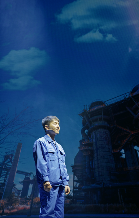 4月30日晚,舞台剧《百年对话》在北京大学百周年纪念讲堂上演。图为青年演员孙一理在舞台剧中饰演北京首钢园运动中心运营管理有限公司第一代制冰工刘博强。