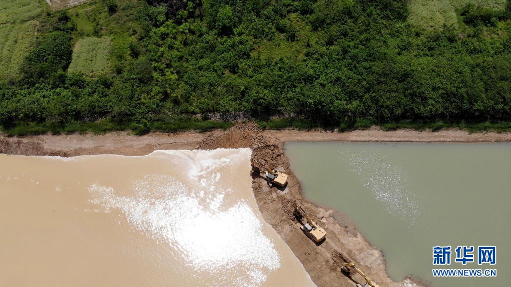 5月1日,工人在引江济淮淠河总干渠渡槽项目工地施工,将淠河水引入渡槽(无人机照片)。
