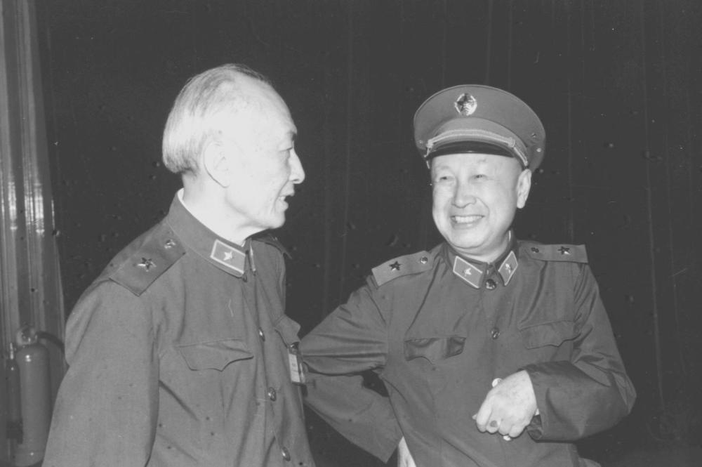 1987年4月,在国防科工委2000年高技术发展工作会议上,钱学森(右)与著名科学家朱光亚亲切交谈。新华社记者邹毅摄