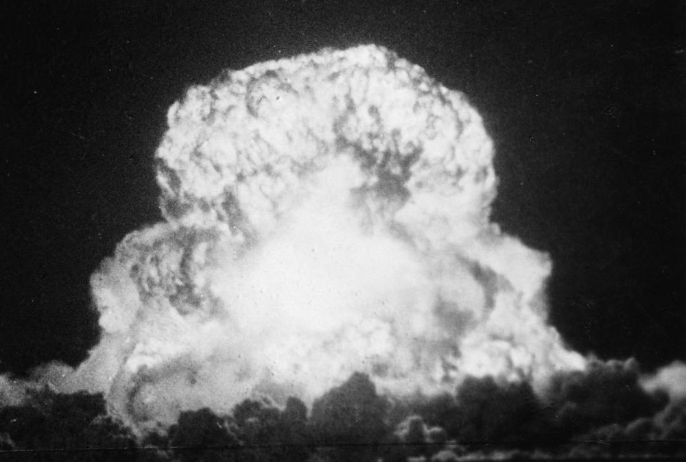1964年10月16日15时中国第一颗原子弹爆炸成功。这是爆炸时的火球(图一)和随即升起的蘑菇状烟云。新华社发