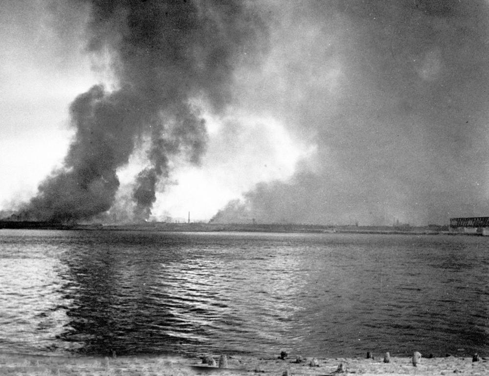 这是1950年10月朝鲜新义州在浓烟烈火中。新华社发