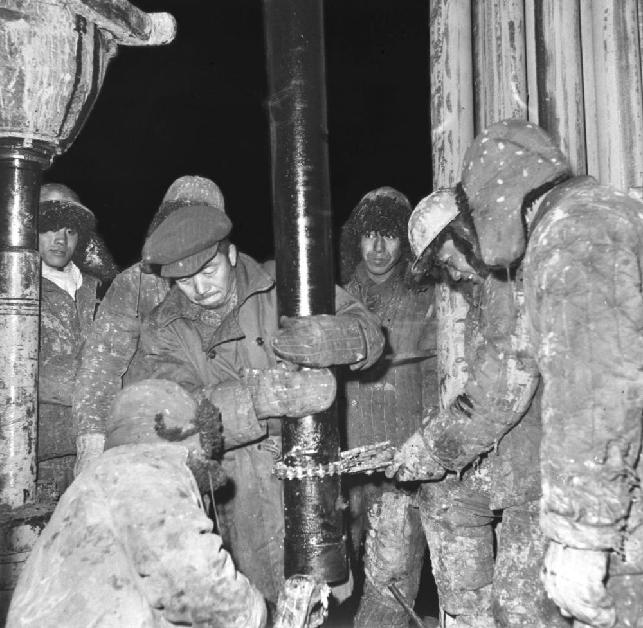1964年冬,大庆“铁人”王进喜(左二)深夜在井台上和工人一起下套管。新华社记者雪印摄