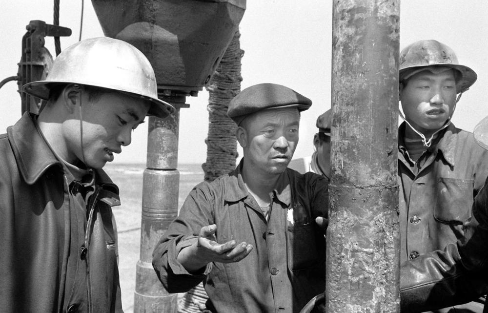 1965年,“铁人”王进喜(右)在钻井旁工作。新华社发