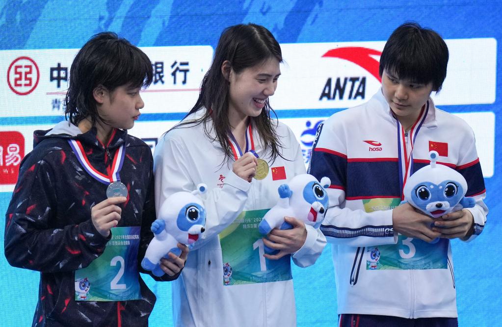 在女子400米自由泳决赛中,19岁的李冰洁最后100米甩开其他对手,以4分02秒36获得冠军,这一夺冠成绩也非常接近她保持的亚洲纪录4分01秒75。广东选手汤慕涵以4分05秒15获得银牌,辽宁名将王简嘉禾以4分05秒68摘得铜牌。