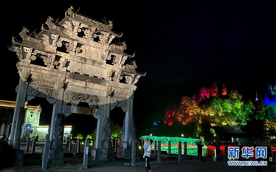 5月1日,在安徽省黄山市黟县西递古村落拍摄的夜景灯光秀。