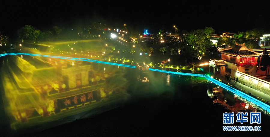 5月1日,在安徽省黄山市黟县西递古村落拍摄的夜景灯光秀(无人机航拍)。