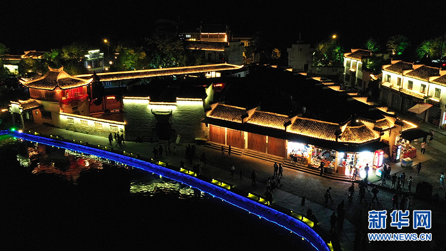 5月1日,在安徽省黄山市黟县西递古村落拍摄的夜景灯光秀(无人机航拍)。