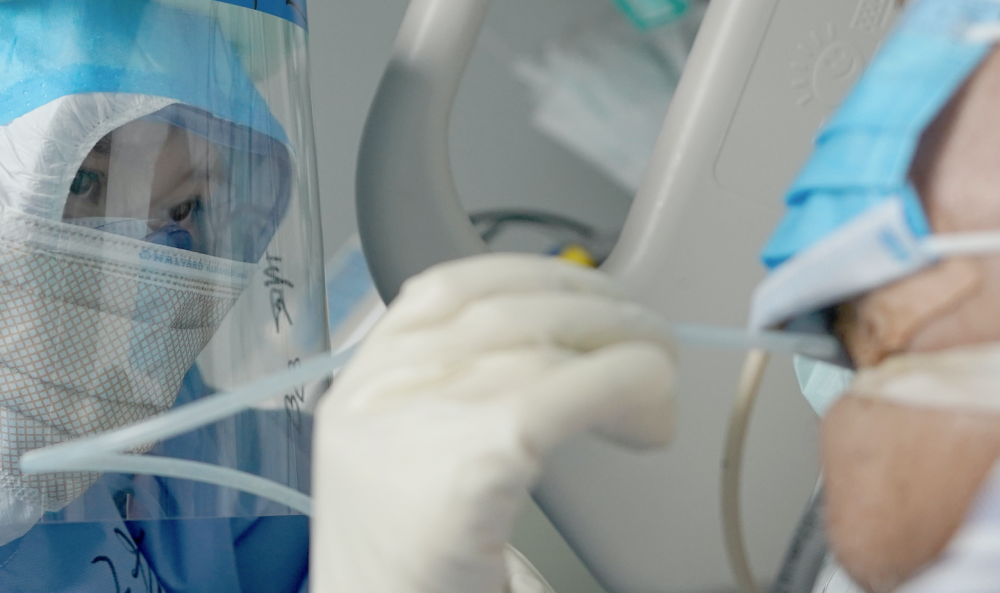 ↑ 2020年3月20日,武汉火神山医院重症医学一科的“90后”护士孙青在为患者吸痰。武汉火神山医院重症医学一科的护理团队共50名护士,其中绝大多数是“80后”“90后”女性,她们不惧危险,奋战在抗击疫情的最前沿“红区”。