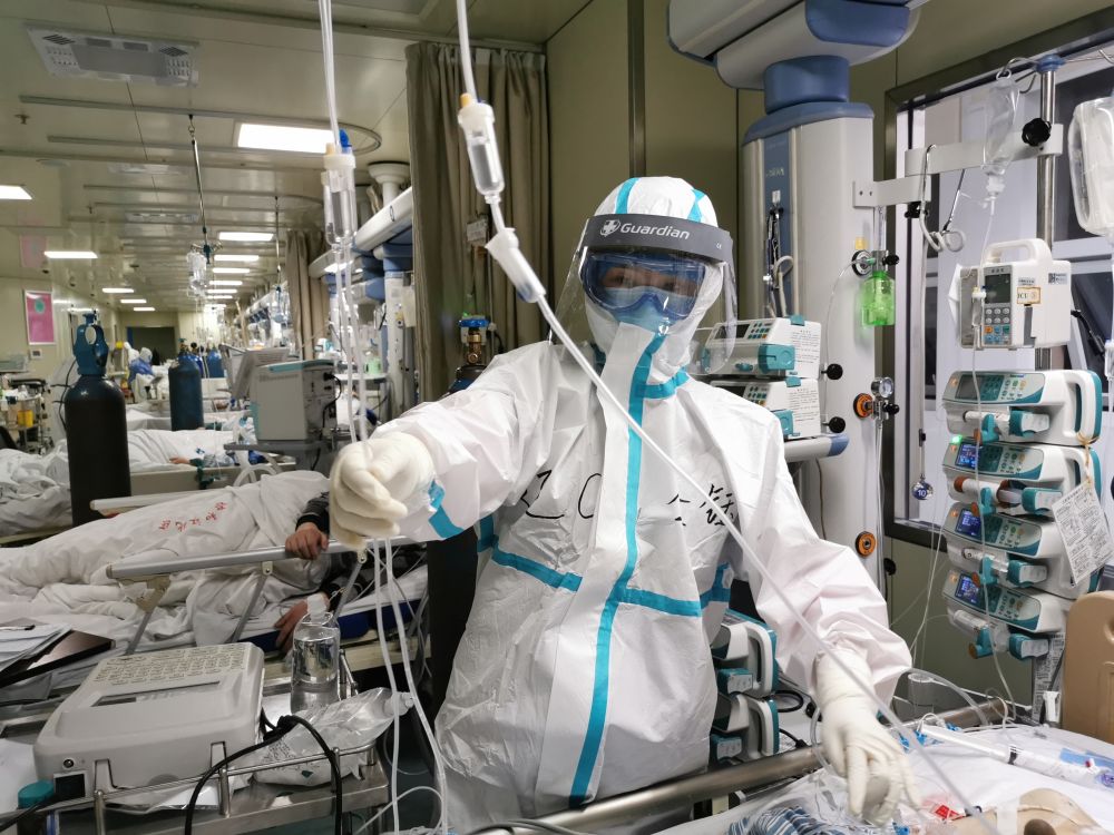 ↑ 2020年2月5日,在武汉协和江北医院重症监护室,辽宁驰援湖北医疗队队员金钰在照顾病人。