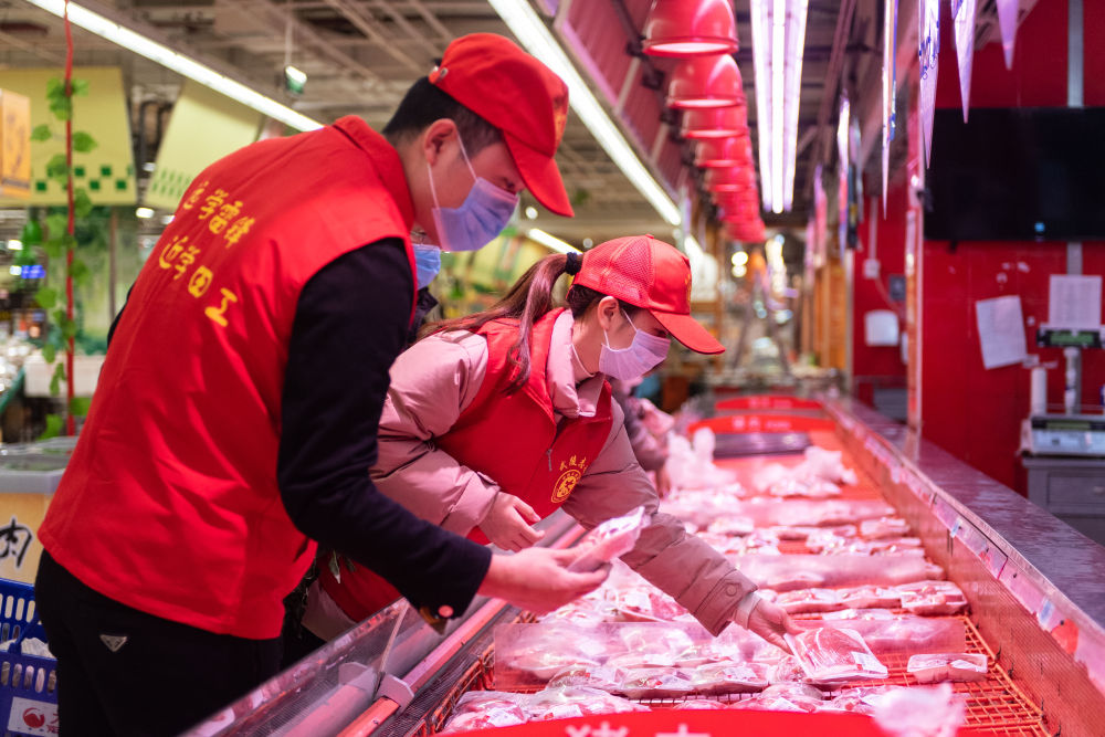 ↑ 2020年2月15日,在湖南省常德市一家超市,常德市武陵区穿紫河街道“学田工”爱心志愿服务队的“90后”志愿者袁宁(右)和潘新友为居家隔离的市民代购食物。