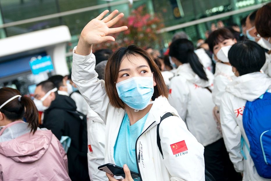 ↑ 2020年3月17日,天津首批援鄂医疗队队员张硕在武汉天河机场向送行的人们挥手告别。新冠肺炎疫情发生后,“90后”张硕第一时间报名参加援鄂医疗队,并在武钢二院担任“红区”护士。在52天的战“疫”中,张硕光荣入党。