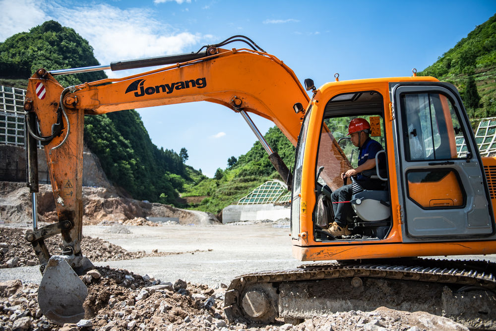 ↑ 2020年6月5日,“90后”苗族青年韦金水在兰海高速重遵扩容项目T12标段工地上操作挖掘机。2017年,来自贵州省黔东南苗族侗族自治州从江县加勉乡的贫困户韦金水参与了贵州路桥集团承建的从江县加勉至加鸠三级路改扩建工程。当年7月,韦金水动员同乡的贫困户组建劳务施工班组参与改扩建工程。班组从组建之初7个人,发展到高峰期20余人。韦金水从此成了“带头人”,使19个贫困务工人员家庭顺利脱贫。