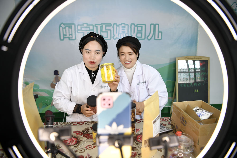 ↑ 2020年11月11日,“90后”女孩海燕(左)和马燕在闽宁禾美电商扶贫车间直播带货。2019年,银川市闽宁镇原隆村的闽宁禾美电商扶贫车间建成投产,优先招录当地留守妇女、建档立卡贫困户。受新冠肺炎疫情影响,车间试水网络直播销售,选出海燕、马燕等6名员工组成了“巧媳妇”直播带货团。