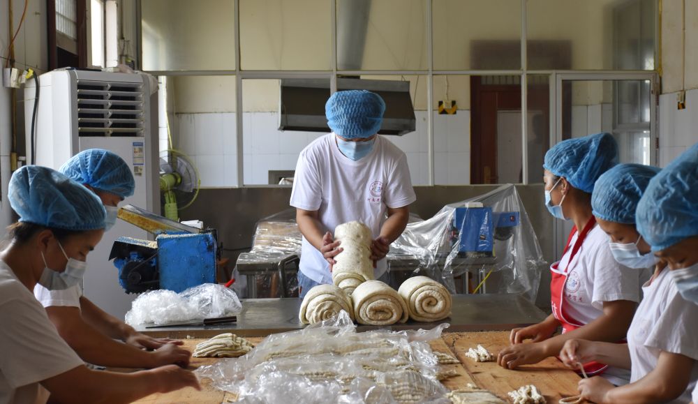 ↑ 2020年7月8日,张亚钊(中)在车间加工面团。“90后”青年张亚博、张亚钊是河南省商丘市民权县王桥镇麻花庄村的双胞胎兄弟。2014年两人大学毕业后,先后回到家乡,传承麻花庄的祖传贡麻花制作手艺。麻花庄村是当地的贫困村,张亚博、张亚钊在发展自家事业的同时,也为村里的麻花产业发展出谋划策。