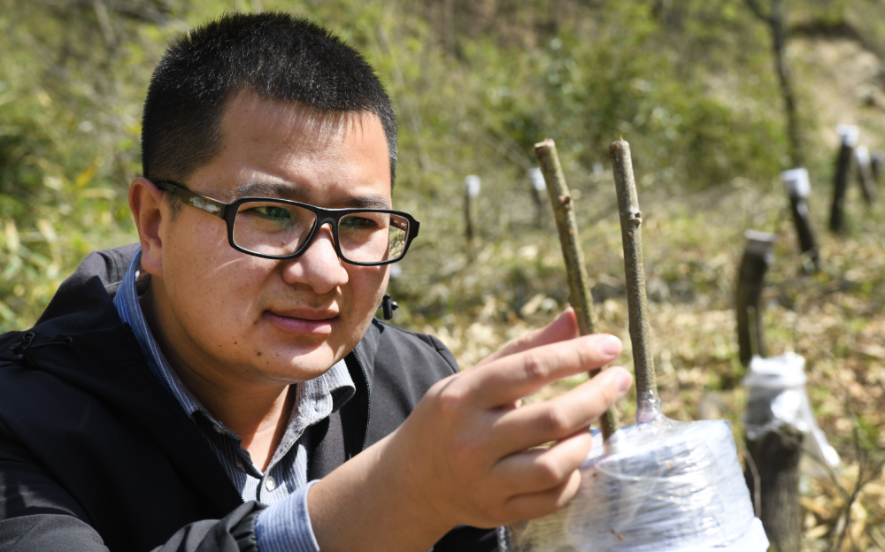 ↑ 2020年4月15日,尹鹏先在查看板栗林嫁接生长情况。“90后”尹鹏先2018年7月从西北农林科技大学林学院生态学专业博士研究生毕业,同年8月,尹鹏先作为选调生被下派到秦岭腹地的陕西省汉中市留坝县工作,先在留侯镇庙台子村党支部副书记岗位上历练了4个月。2019年1月,他正式担任起火烧店镇烧房坝村党支部书记。
