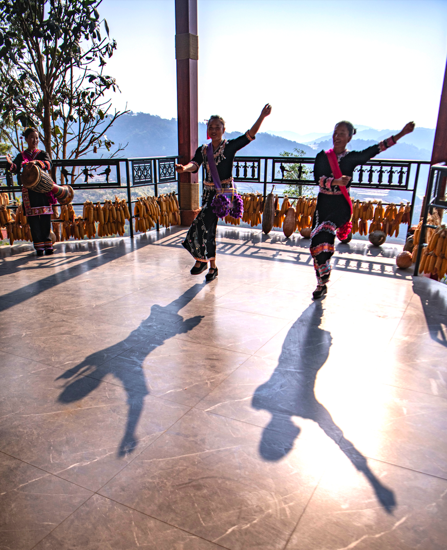 ↑ 2021年3月4日“90后”拉祜族姑娘郭玉兰(中)与“摆舞队”队员们在村里排练舞蹈。“摆舞”是拉祜族代表性的民间舞蹈之一,“摆舞队”的队员们农忙时在田间劳作,农闲时为游客表演,也经常将精彩的演出和幸福的生活场景上传到网络平台,向大家展现偏远山村极具特色的乡村文化生活新图景。