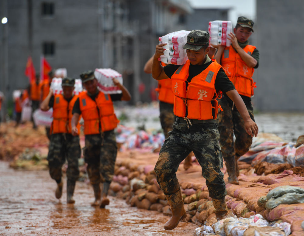 ↑ 2020年7月13日,刘意飞(前)和战友们为大家运送矿泉水。2020年7月8日,接到上级紧急命令后,武警江西总队机动支队防化中队的“00后”小战士刘意飞跟随部队来到昌江圩,开始了他人生中第一场抗洪战役。