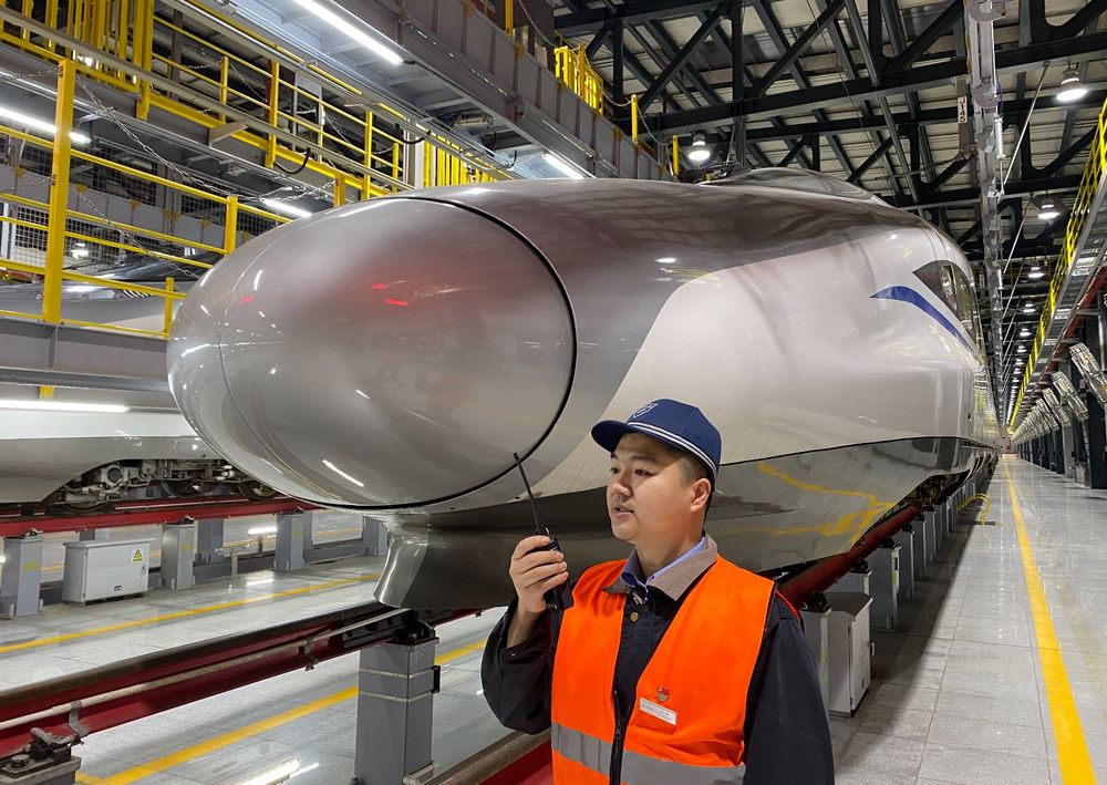 ↑2020年4月28日,“90后”动车组机械师刘鹏与同事进行相互联控作业。刘鹏毕业于湖南铁道职业技术学院,在2016年全国铁路动车组机械师职业技能竞赛中,他位列各项目综合排名全能榜首。