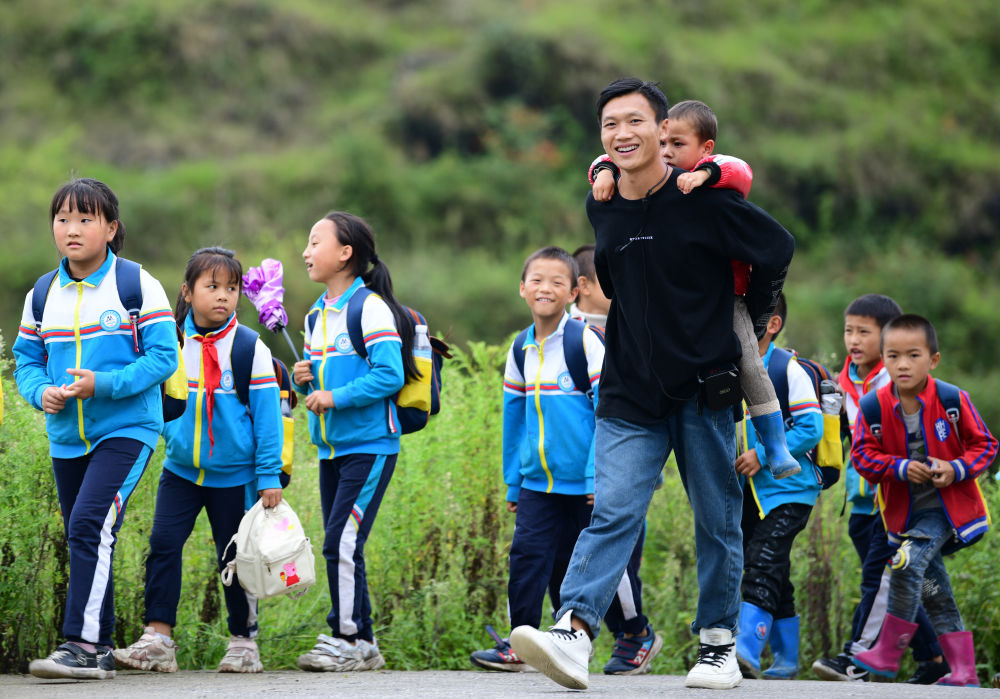 ↑ 2020年9月16日,在贵州省毕节市织金县龙场镇双山村,彭有兴护送学生回家途中背着一名年纪较小的孩子。彭有兴是贵州省毕节市织金县的一名“90后”教师。2018年,他进入织金县龙场镇双山小学任语文老师,还兼任体育、音乐、思想政治课老师。
