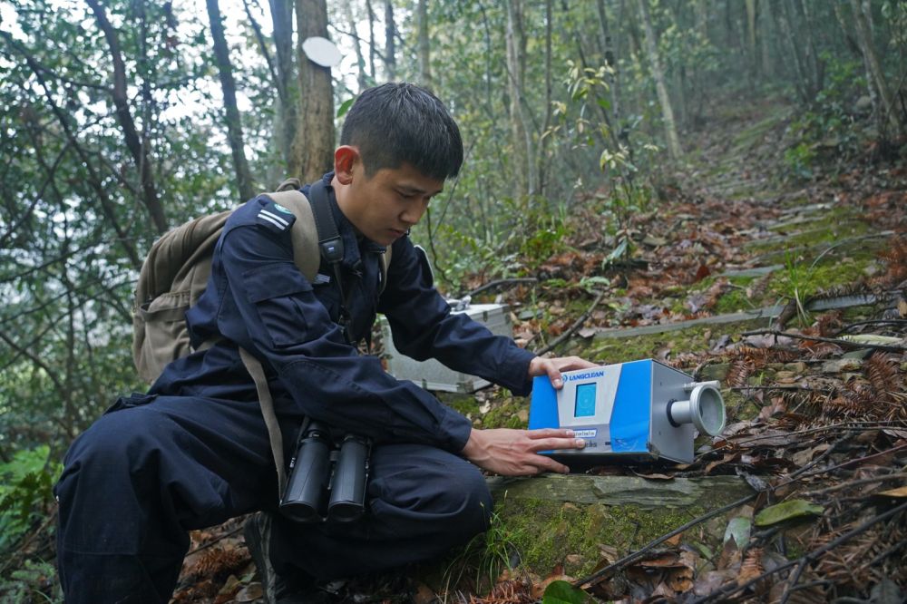 ↑ 2021年3月17日,陈亮亮在巡护途中检测山林中的负氧离子含量。“90后”山东小伙儿陈亮亮是九岭山国家级自然保护区青山保护管理站的工作人员,主要负责辖区内动植物科研监测、森林资源保护和宣传教育工作。
