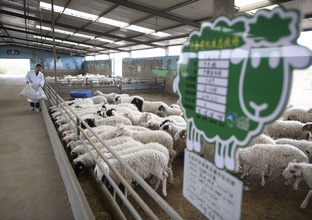 ↑2019年5月27日,冯欢在羊场为滩羊喂料。1990年出生的冯欢是宁夏盐池人,2012年从宁夏大学毕业后到北京工作。一直放不下家里的父母长辈的他,于2015年10月返乡,通过技术入股加入刚筹建不久的宁鑫生态牧场,饲养滩羊,开始自己的“羊倌梦”。