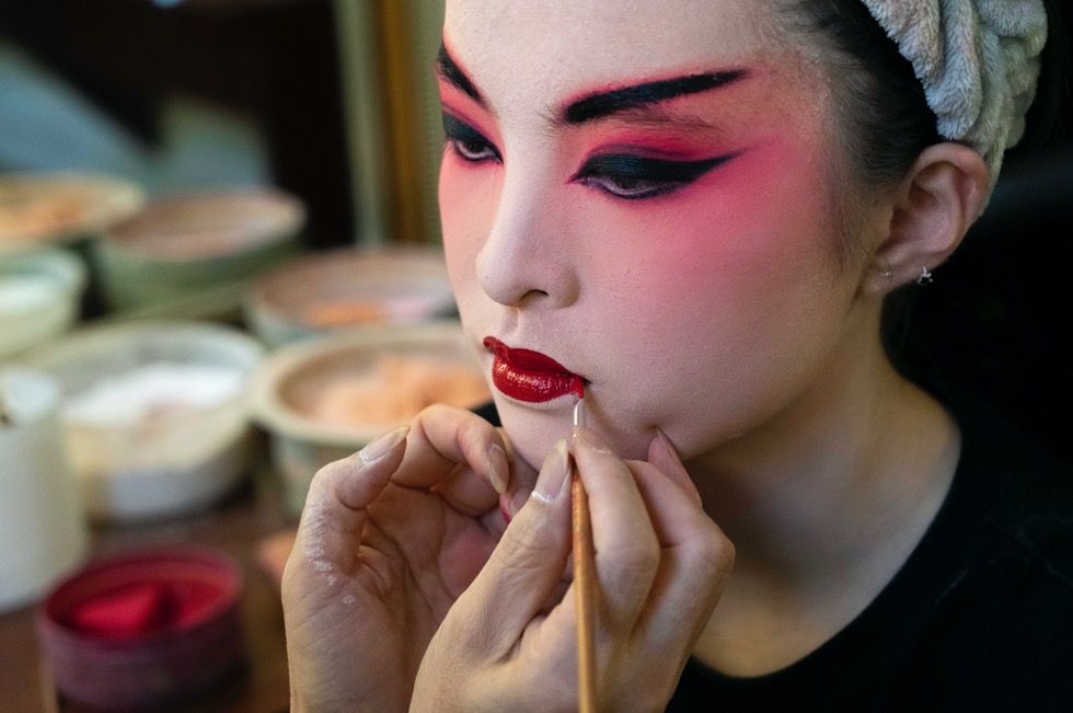↑ 2020年6月10日,“00后”杜苏琳娜在云南省滇剧院化妆间里化妆。杜苏琳娜从9岁开始学习滇剧,是云南省滇剧院与云南文化艺术职业学院联合开办的滇剧非物质文化遗产传承班的首批学生之一,她希望能和老师、同学们一道推广滇剧这一极具云南地方文化特色的传统艺术。