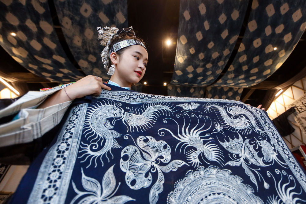 ↑2021年4月25日,王欣颖在蜡染体验店内整理自己制作的蜡染作品。21岁的王欣颖是贵州丹寨县人,6岁开始接触蜡染,19岁被评为丹寨县蜡染非遗传承人。
