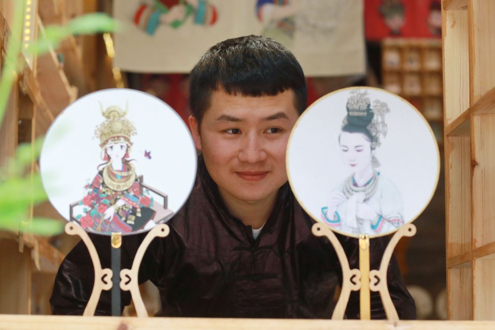 ↑2019年4月16日,在贵州黎平,兰才生在插画馆内查看根据自己插画作品制作的扇面。“90后”侗族青年兰才生2015年大学毕业后回到家乡贵州黎平,在肇兴侗寨内创立“兰才生插画馆”,以苗族侗族的少数民族文化为主题创作插画,开发衍生文创产品。
